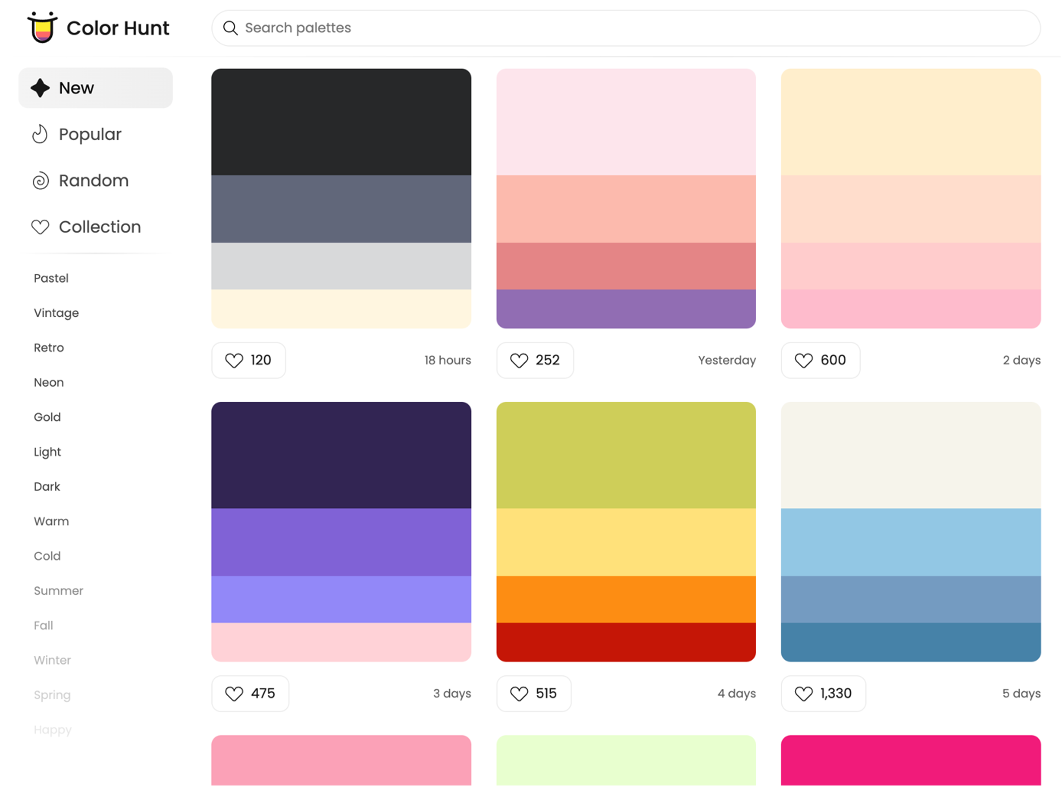 Endlose Inspiration: Color Hunt ist ein endloser Ozean von Farbkombinationen. Es gibt Tausende von Paletten, die von der Community erstellt und freigegeben werden. Sie sind in verschiedene Kategorien wie „Beliebt“, „Zufällig“, „Neueste“ usw. sortiert. Das Durchstöbern dieser Paletten kann unerwartete Ideen und Inspirationen hervorbringen.