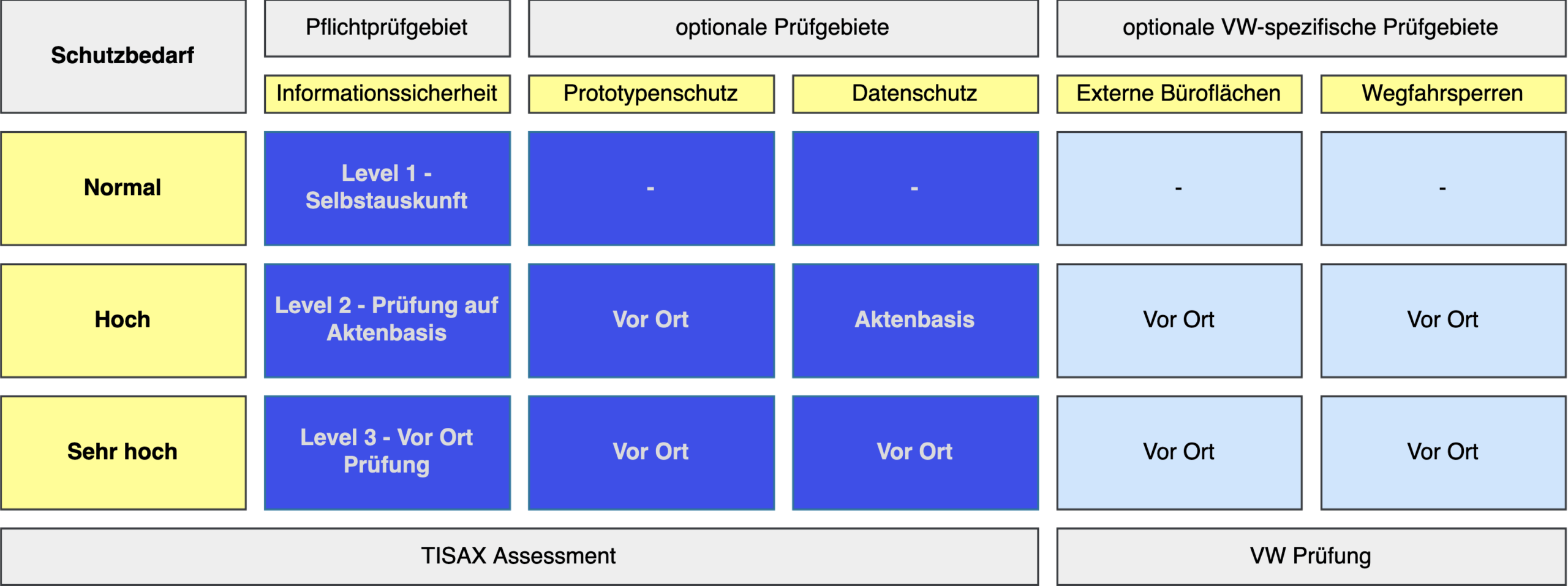 Nachfolgende Abbildung zeigt die Schutzbedarfe, die verschiedenen Prüfgebiete und die damit verbundene Art der Prüfung: